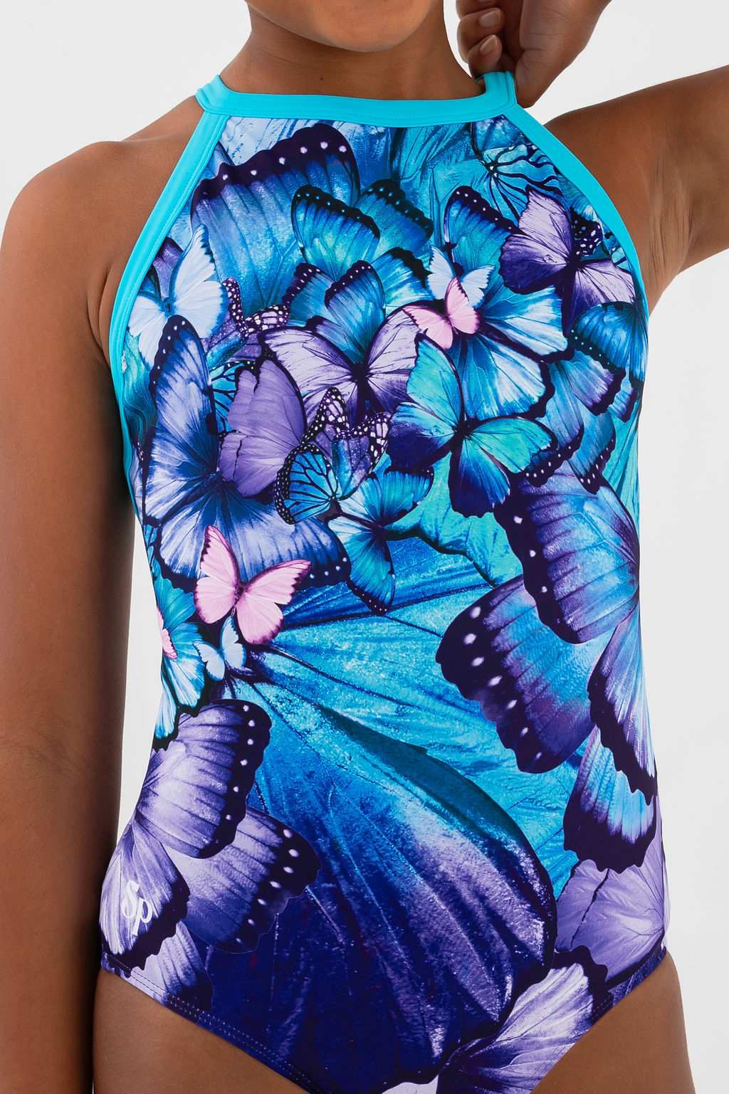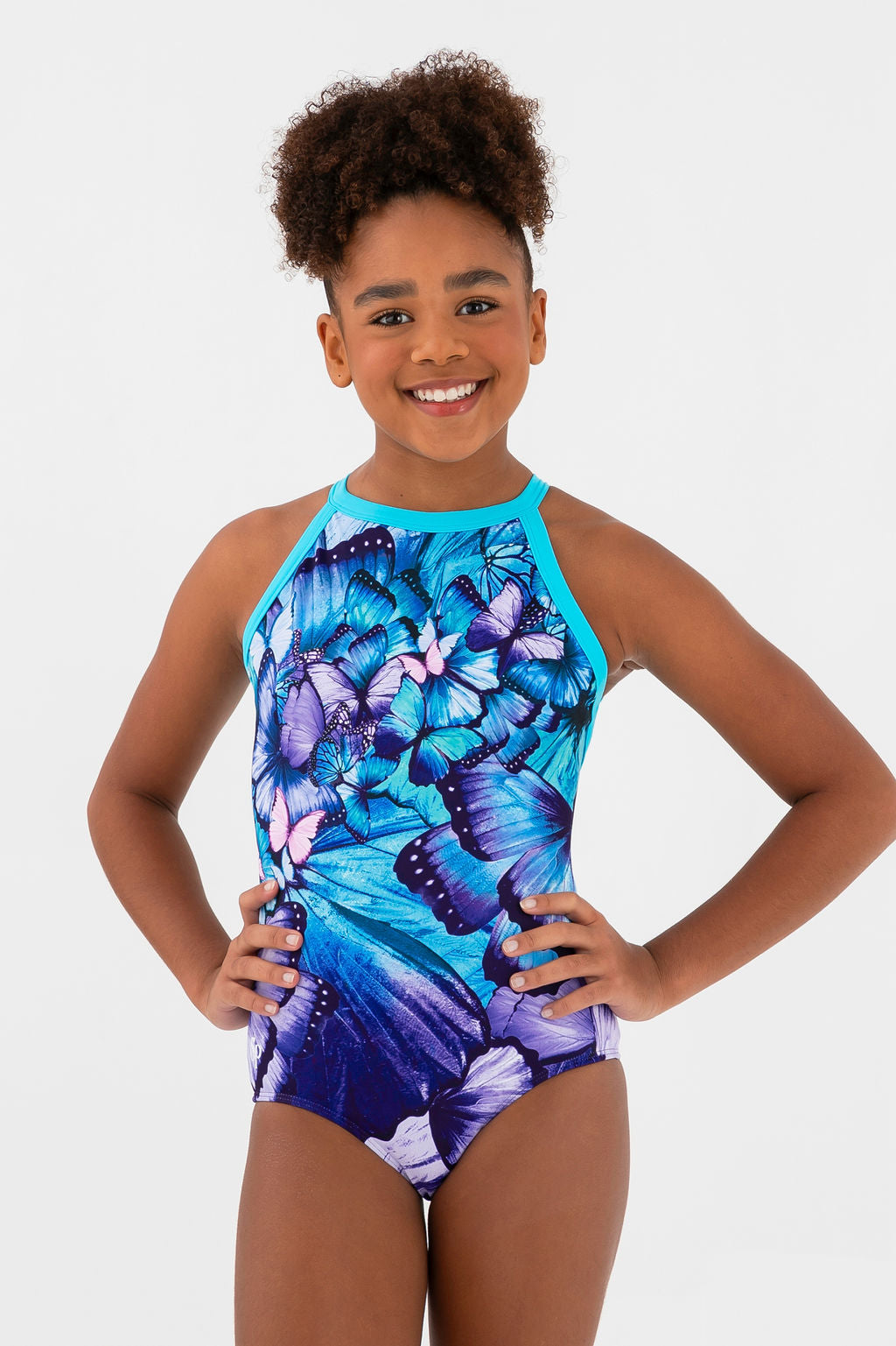 Enter a tropical paradise where butterflies flutter about in a mesmerizing display of color. The Butterfly House Leotard is styled in a high halter neckline with a back clasp for easy-to-wear functionality. The back has an elegant low scoop with criss-cross strap details.